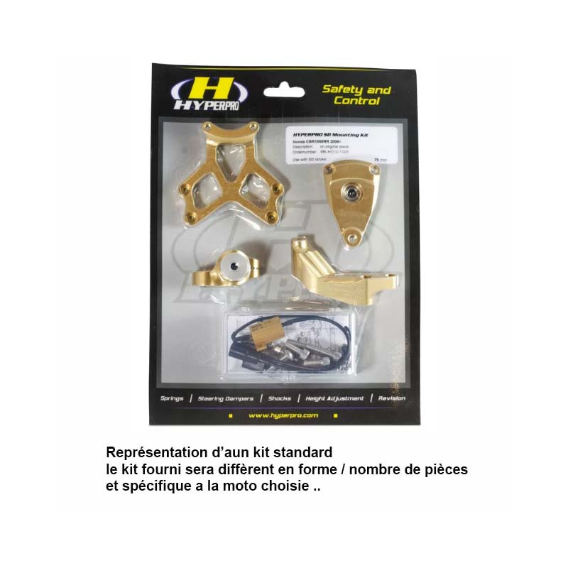 le kit de fixation sous T de fourche Hyperpro , permet le montage du vérin Hyperpro en position basse ( sous le T de fourche )