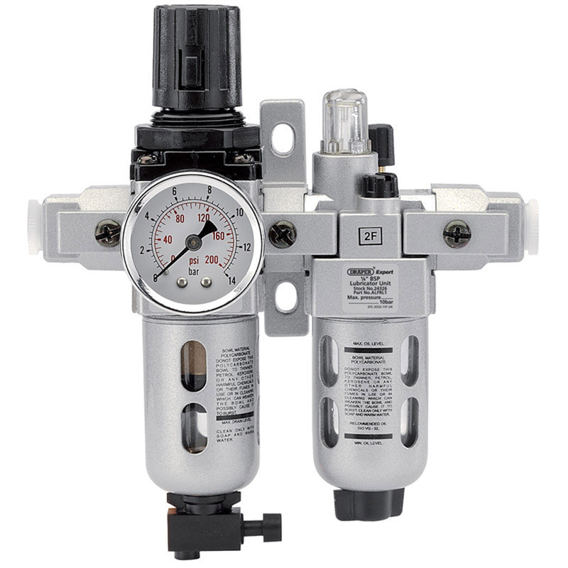 Ensemble complet de traitement d’air, recommandé pour les compresseurs d’une capacité inférieur à 200 L. Elimine l’humidité et les impuretés contenues dans le réseau d’air comprimé tout en lubrifiant l’air pour ne pas endommager vos outils pneumatiques.Livré avec support de fixation murale et manomètre. Pression: 0 a 10barsFiletage entrée/sortie: 1/4"