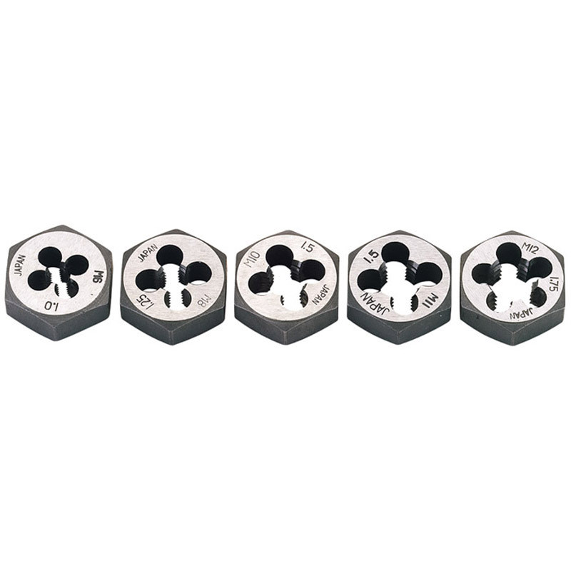 • Set de 5 filières à pas métrique en acier traité carbone.Dimensions : 6 x 1,00 - 8 x 1,25 - 10 x 1,50 - 11 x 1,50 - 12 x 1,75mm.Porte-filière associé : 891 4446