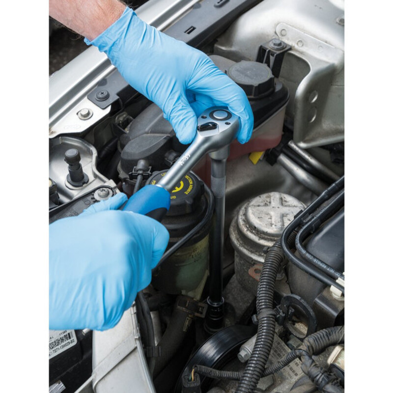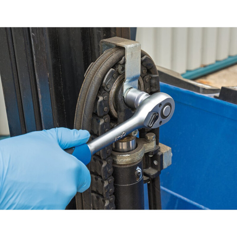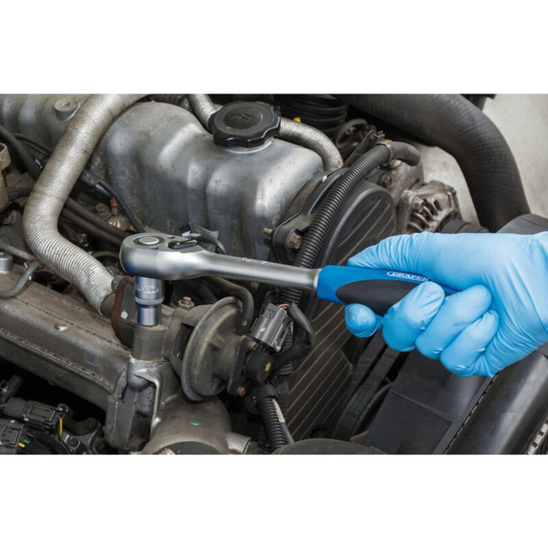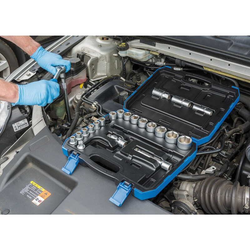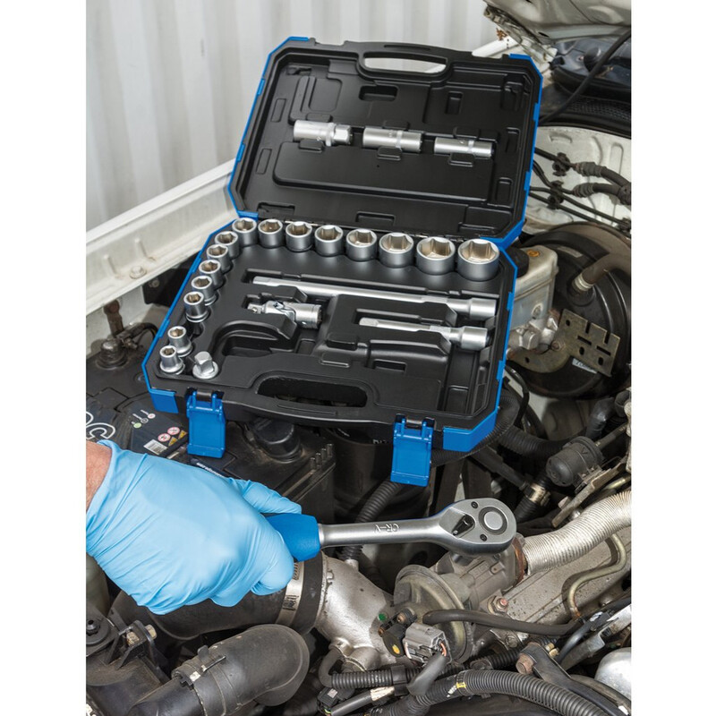 Douille à six pans en acier au chrome vanadium trempé et revenu avec une finition satinée. Fourni avec un cliquet réversible à prise souple de 72 dents et des accessoires. Emballé dans un étui de rangement en plastique.