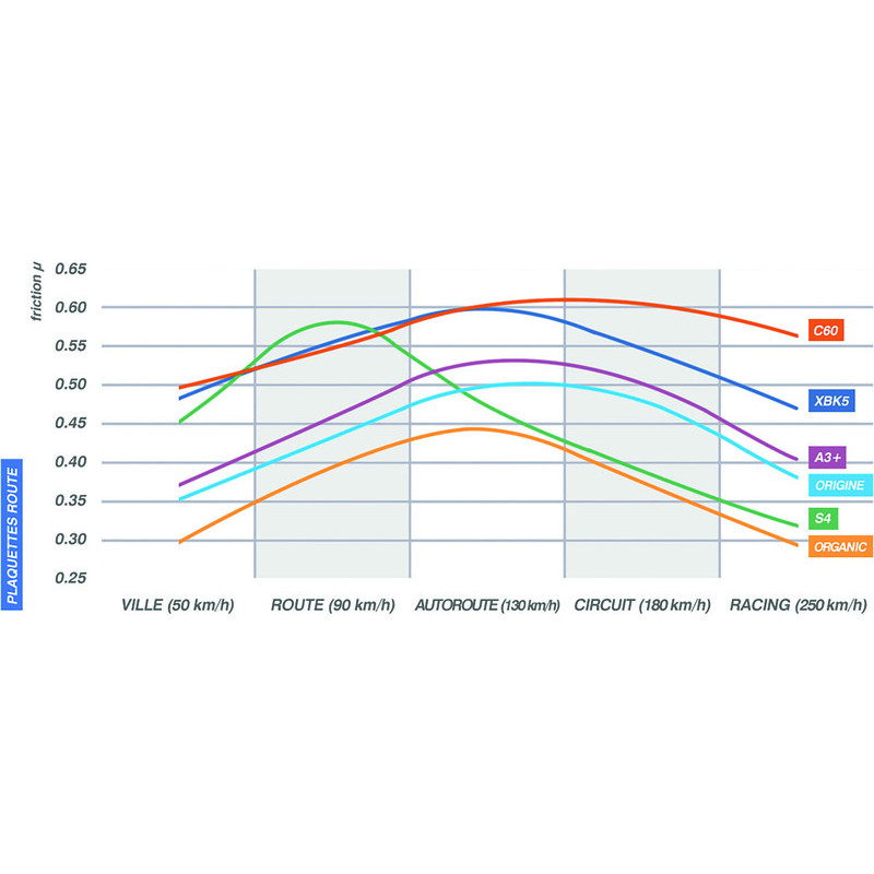 Gamme C60, pour utilisation racing uniquement Très bon grip, frein extrêmement réactif. Performances élevées à faible ou haute température. Excellent respect du disque. Produits développés par les meilleurs pilotes en conditions de course.
